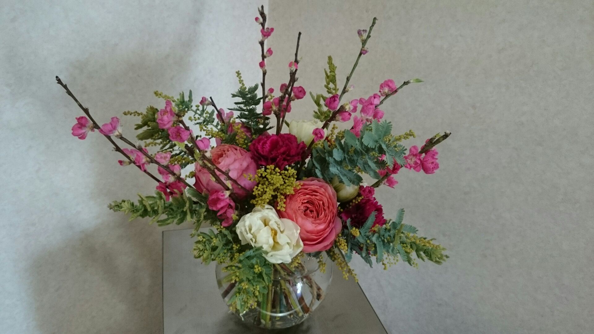 先日、雛人形のことをブログでご紹介しましたが、今週は桃の花が入ったアレンジが届きました。