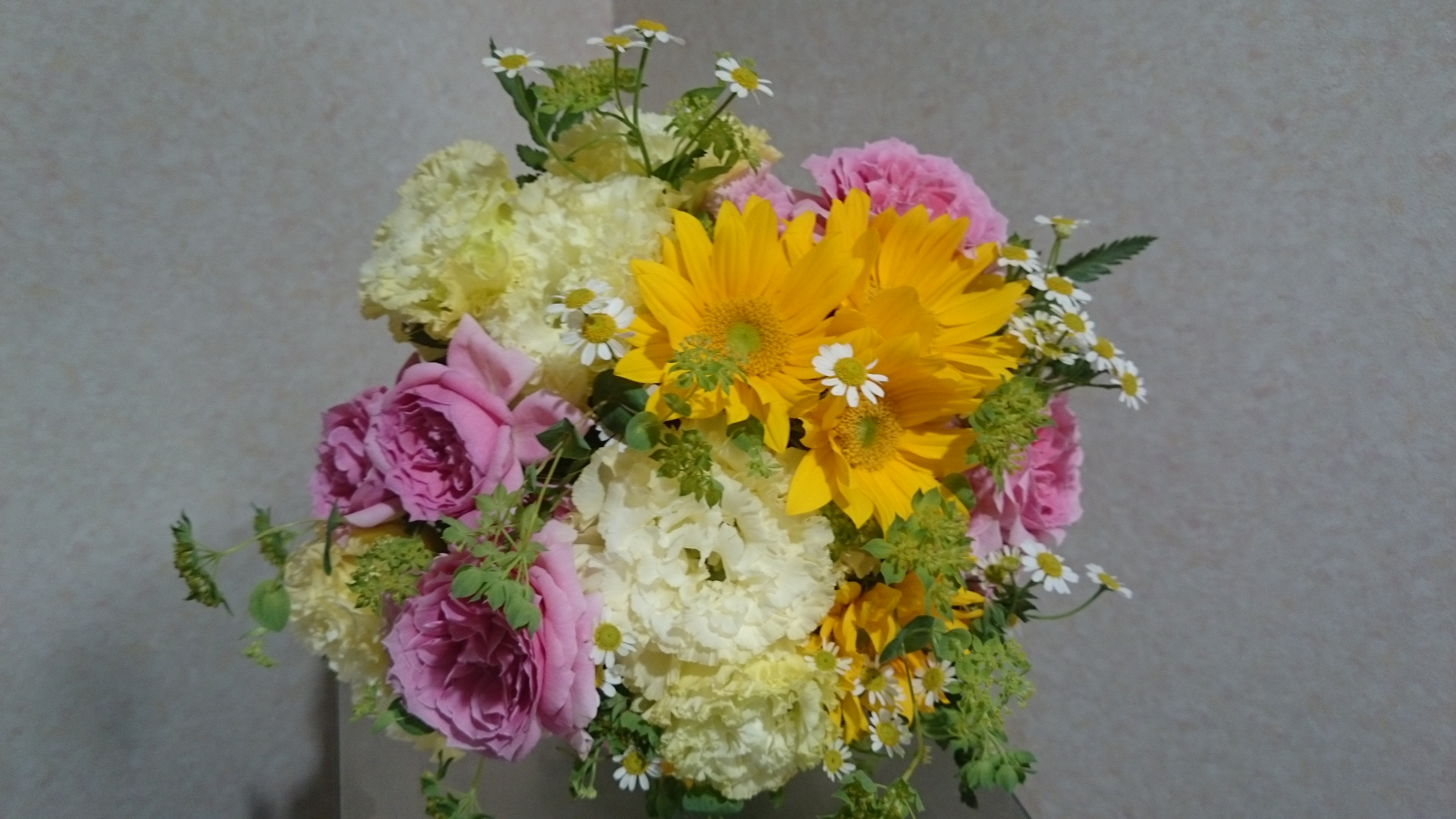 ヒマワリ・スプレーバラ・トルコキキョウ・マトリカリア・ブプレウルム・レザーファン